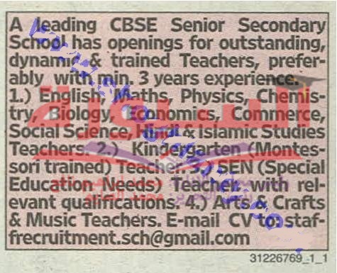 تعلن احدى المدارس الخاصة بدولة الامارات عن حاجتها الى معلمين فى الكيمياء وعلوم اجتماعية ودراسات اسلامية، وعلى الراغبين فى التقدم خلال الايميل المنشور فى الاعلان التالى: