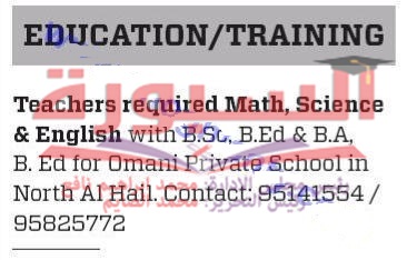 تعلن مدارس الهيل بسلطنة عمان عن حاجتها الى معلمين فى الرياضيات والعلوم واللغة الانجليزية، وعلى الراغبين فى التقدم الاتصال على الأرقام المنشورة فى الاعلان التالى: