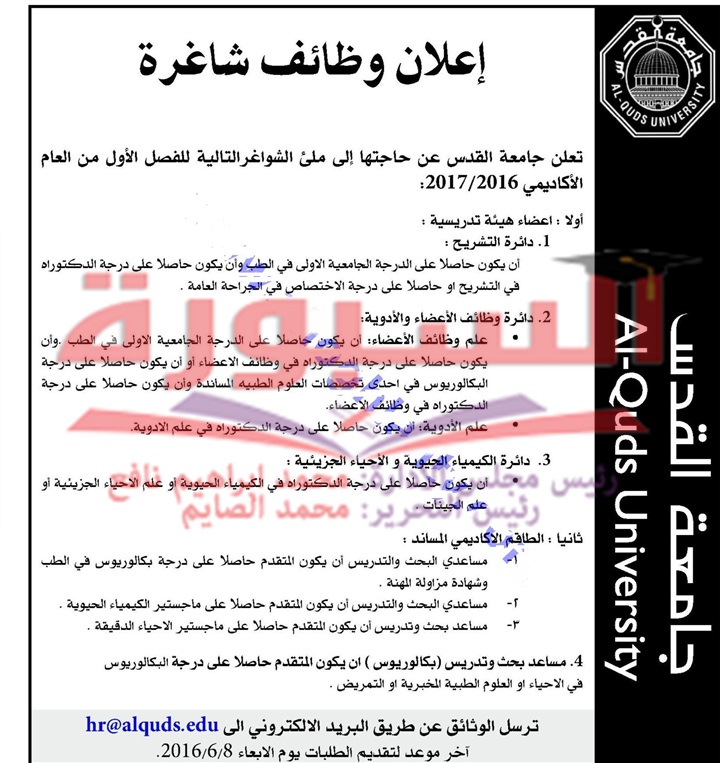 تعلن جامعة القدس بدولة فلسطين الشقيقة عن حاجتها الى وظائف لاعضاء هيئة التدريس، وعلى الراغبين فى التقدم ارسال السيرة الذاتية على الايميل التالى المنشور فى الاعلان، وآخر موعد للتقديم 8 يونيو 2016.