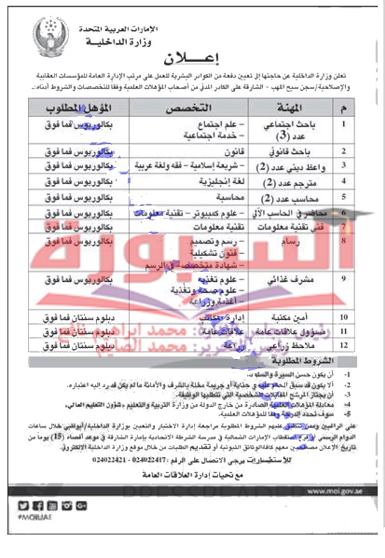 تعلن وزارة الداخلية الاماراتية عن حاجتها الى باحثين، وعلى الراغبين فى التقدم ارسال السيرة الذاتية أو المقابلة الشخصية على العنوان المنشور فى الاعلان التالى: