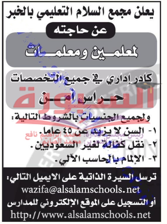 يعلن مجمع السلام التعليمى بالخبر بالمملكة العربية السعودية عن حاجتها الى معلمين ومعلمات فى جميع التخصصات ولجميع الجنسيات، وعلى الراغبين فى التقدم ارسال السيرة الذاتية على الايميل التالى المنشور فى الاعلان أدنى الخبر.