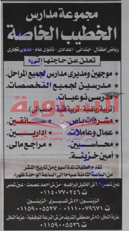 تعلن مجموعة مدارس الخطيب الخاصة عن حاجتها الى موجهين ومديرى مدارس ومعلمين فى جميع التخصصات، وعلى الراغبين فى التقدم للوظائف تقديم الطلبات لمدة أسبوع من تاريخ النشر حسب الاعلان المنشور فى جريدة الاهرام، ولمزيد من التفاصيل عبر الاعلان التالى: