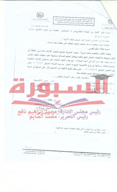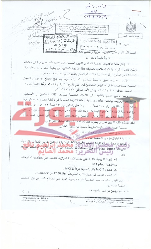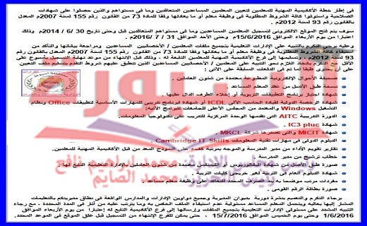 اعلنت الاكاديمية المهنية للمعلمين عن فتح الموقع الالكتروني لتسجيل المعلمين المساعدين ومافى مستواهم المتعاقدين قبل وحتى تاريخ 2016/6/30 اعتبارا من 2016/6/15 حتى 2016/7/31 م