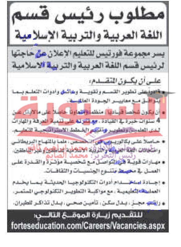 تعلن مجموعة فورتيس للتعليم والاعلان عن حاجتها الى رئيس قسم اللغة العربية والتربية الاسلامية، وعلى الراغبين فى التقدم ارسال السيرة الذاتية على الايميل المنشور فى الاعلان التالى: