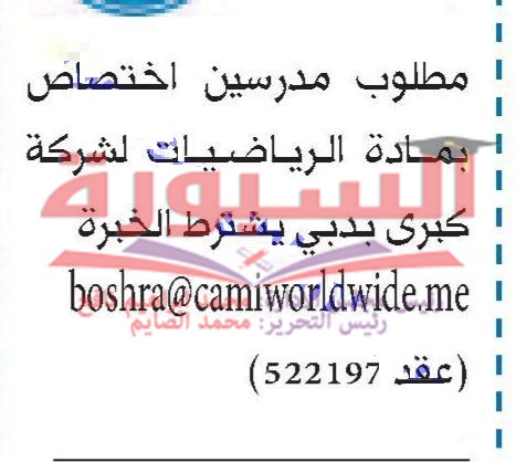 تعلن مدرسة خاصة في دولة الامارات عن حاجتها للتعاقد مع معلمين وذلك في المواد التالية:
