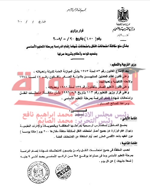 ينشر موقع السبورة التعليمى القرار رقم 150 بشأن منح مكافأة امتحانات النقل وشهادة اتمام الدراسة بمرحلة التعليم الأساسى وتحديد قواعد وأحكام وشروط صرفها.