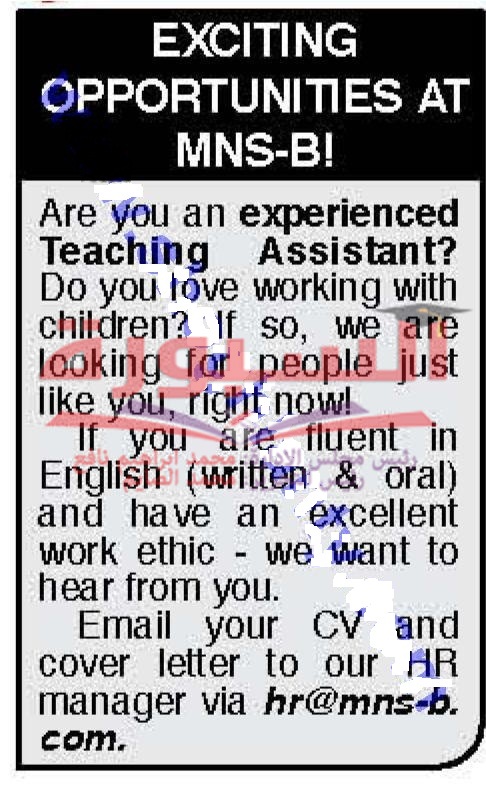 تعلن احدى المدارس بدولة البحرين عن حاجتها الى معلمين مساعدين، شرط الخبرة وكيفية معاملة الاطفال، مع اجادة اللغة الانجليزية كتابة وقراءة، وعلى الراغبين فى التقدم ارسال السيرة الذاتية على الايميل المنشور فى الاعلان التالى: