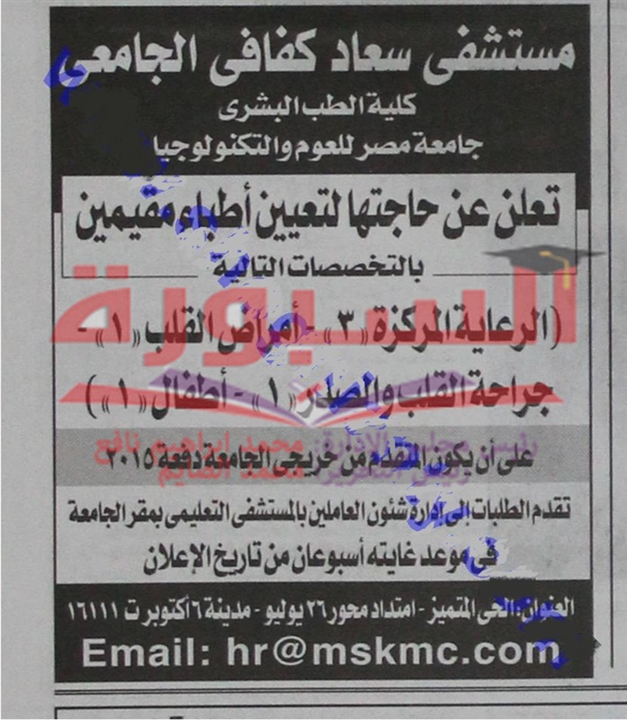 تعلن جامعة مصر للعلوم والتكنولوجيا عن حاجتها الى اكاديميين للتدريس فى كلية الطب البشرى، وعلى الراغبين فى التقدم ارسال السيرة الذاتية على الايميل المنشور فى جريد الاهرام اليوم 30 مايو 2016.