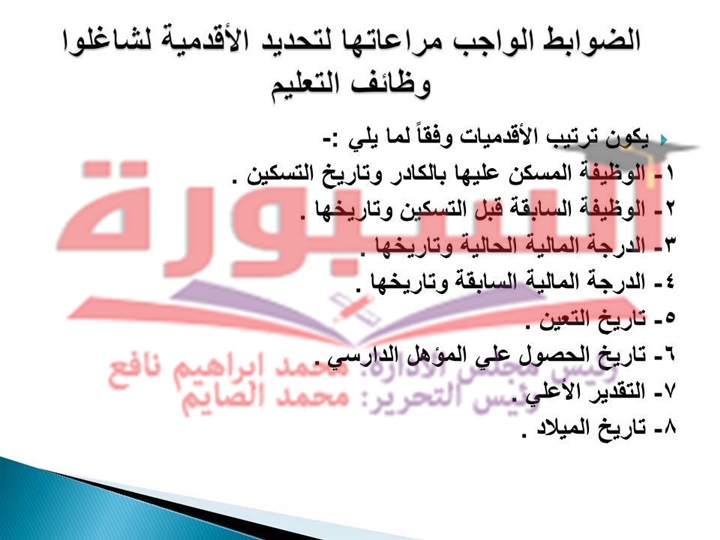 ننشر الضوابط الواجب مراعاتها لتحديد الأقدمية لشاغلوا وظائف التعليم من المعلمين