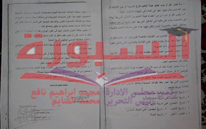 ينشر موقع السبورة التعليمى الحالات التى لا يجوز فيها نقل المعلمين خارج الادارات التعليمية والمديريات بوزارة التربية والتعليم.