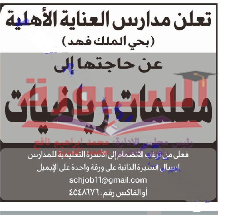 تعلن مدارس العناية الالهية بحى الملك فهد بالمملكة العربية السعودية عن حاجتها الى معلمات فى مادة الرياضيات، وعلى الراغبين فى التقدم ارسال السيرة الذاتية فى ورقة واحدة على الايميل المنشور فى الاعلان التالى: