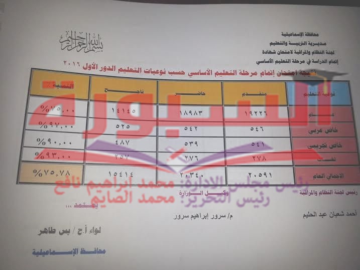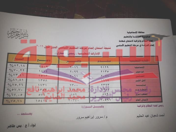 اعتمد اللواء ياسين طاهر محافظ الإسماعيلية نتيجة الشهادة الاعدادية للعام الدراسي 2015 \2016 بنسبة نجاح بلغت 75.8 % .