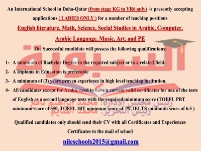مدارس دولية بالدوحة بدولة قطر تعلن عن حاجتها الى مدرسين .. التفاصيل فى الاعلان