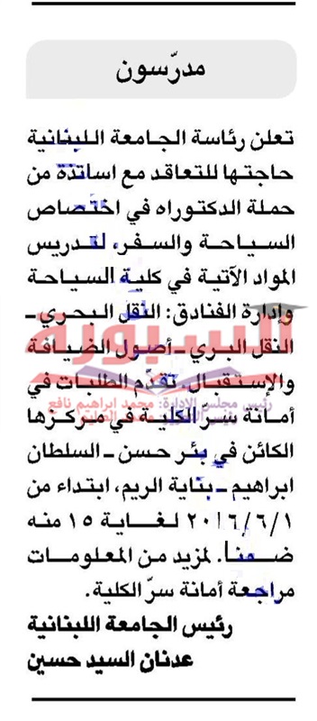 تعلن الجامعة اللبنانية عن وظائف شاغرة لأعضاء هيئة التدريس "من معيد الي أستاذ" وذلك وفقا للإعلان التالي: