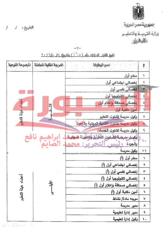 اعتمد الدكتور الهلالى الشربينى، وزير التربية والتعليم والتعليم الفنى، قرار رقم 165 بتاريخ 31 / 5 / 2016 بشأن جدول وظائف اعضاء هيئة التعليم الجديد وذلك وفقا لقانون كادر المعلم رقم 155 لسنة 2007 مع ضرورة تعديل استمارة موازنة وظائف مديريات التربية والتعليم بالمحافظات طبقا لما هو وراد بالقرار ، واخطار الجهاز المركزى للتنظيم والادارة بصورة من هذا القرار .