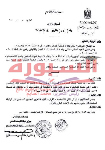 ننشر القرار الوزارى الخاص بشأن اجراءات تعيين معلم مساعد