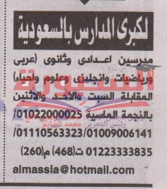 تعلن كبرى المدارس بالمملكة العربية السعودية عن حاجتها الى معلمين فى جميع المراحل، وعلى الراغبين فى التقدم ارسال السيرة الذاتية على الايميل المنشور فى جريدة الاهرام.