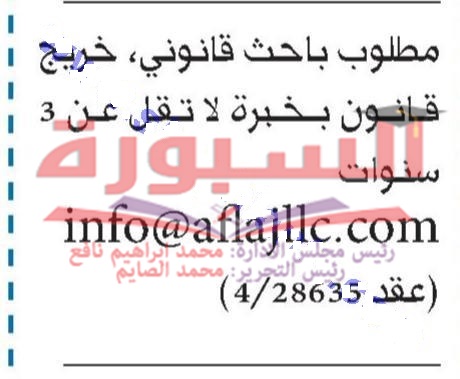 تعلن دولة الامارات العربية المتحدة عن حاجتها الى باحثين قانونيين، وعلى الراغبين فى التقدم ارسال السيرة الذاتية من خلال الايميل المنشور فى الاعلان التالى: