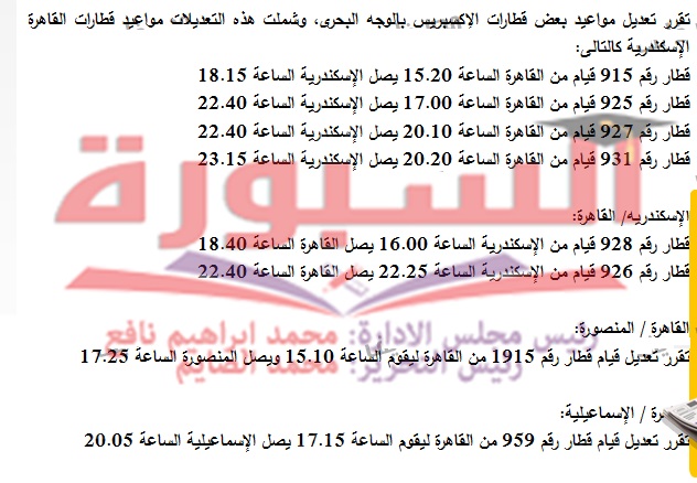 وأوضحت الهيئة القومية لسكك حديد مصر، أنه تم تعديل مواعيد بعض قطارات الإكسبريس بالوجه البحري/ من القاهرة للإسكندرية والعكس، كما تم تغير مواعيد القطارات المتجهة من محافظة القاهرة لمحافظة المنصورة، وتم تعديل أيضآ مواعيد القطارات المتجه من محافظة القاهرة إلي محافظة الإسماعيلية.