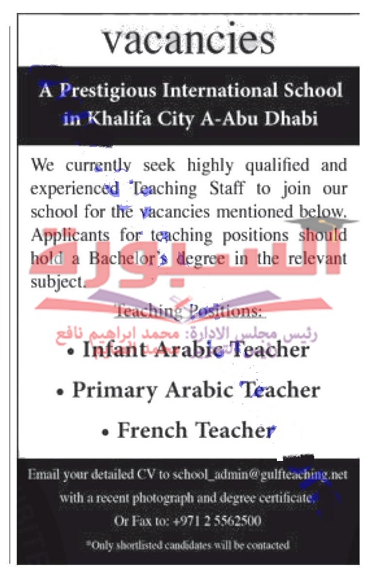تعلن احدى المدارس الخاصة بدولة الامارات العربية المتحدة عن حاجتها الى معلمين، وعلى الراغبين فى التقدم ارسال السيرة الذاتية على الايميل المنشور فى الاعلان التالى: