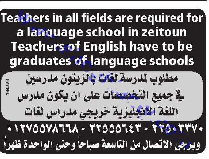 تعلن احدى مدارس اللغات بالزيتون عن حاجتها الى مدرسين فى جميع التخصصات وعلى الراغبين فى التقدم الاتصال على الارقام المنشورة فى الاعلان التالى: