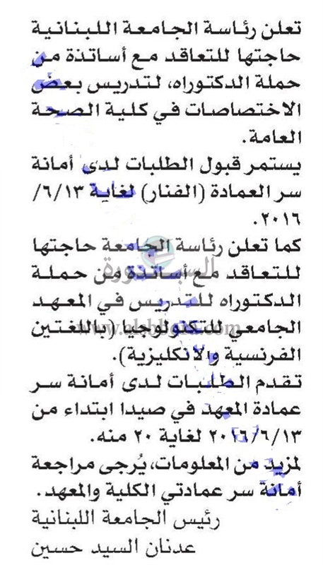 تعلن الجامعة اللبنانية عن حاجتها الى أعضاء هيئة التدريس، وعلى الراغبين فى التقدم فى الاعلان المنشور.