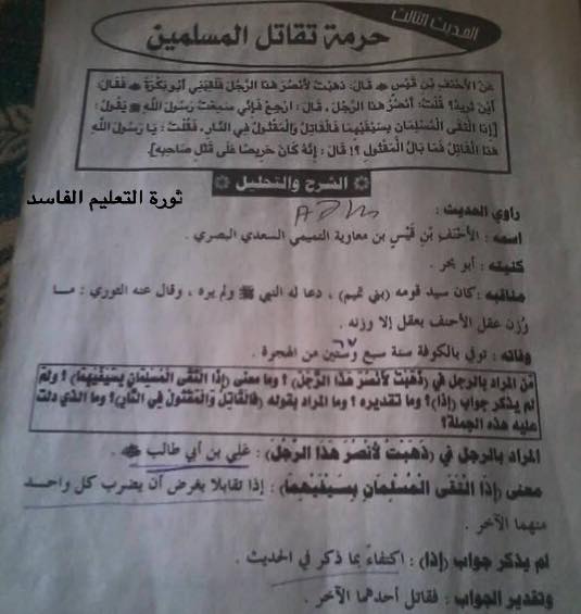 قامت صفحة ثورة التعلم الفاسد بتداول ورقة الأسئلة لمادة الحديث لطلاب الثانوية الأزهرية القسم العلمى الذى يؤدى امتحان مادة الحديث فى اليوم الأربعاء فى تمام الساعة التاسعة صباحا، بعد مرور 20 دقيقة من دخول الطلاب الامتحان، حيث عرضت الحديث الأول بعنوان "حرمة تقاتل المسلمين".