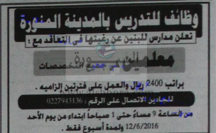 تعلن مدارس المدينة المنورة بالسعودية عن وظائف شاغرة للمعلمين وذلك بمرتبات تبدأ من 2400 ريال واليكم نص الاعلان: