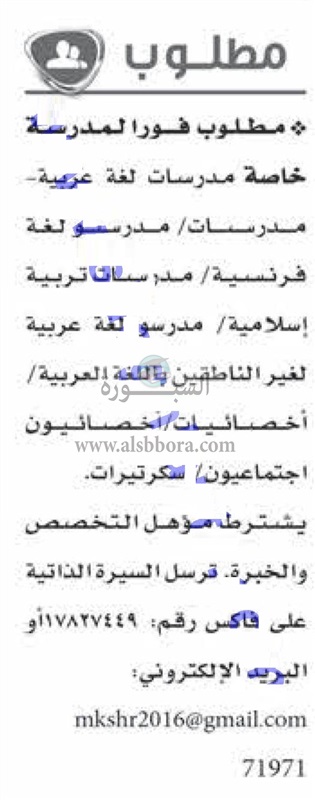 تعلن مدرسة خاصة في البحرين تعلن عن حاجتها للتعاقد مع معلمين وذلك في المواد التالية: