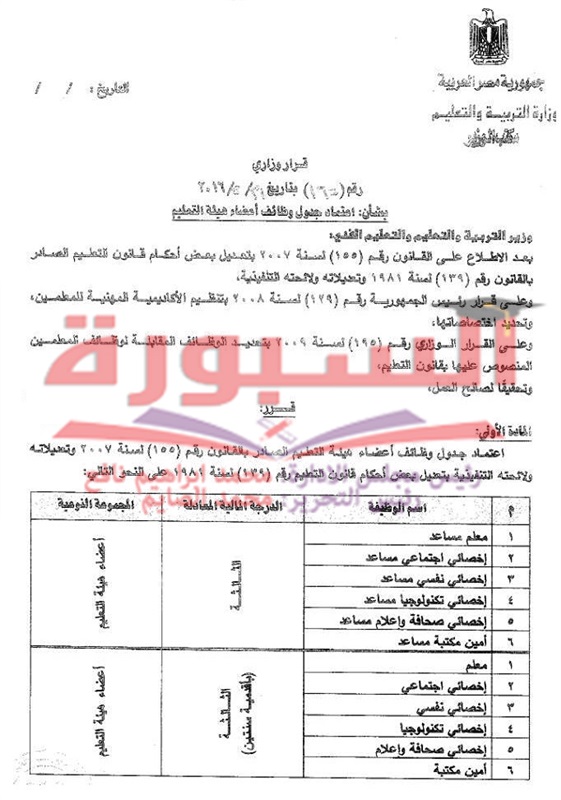 اعتمد الدكتور الهلالى الشربينى، وزير التربية والتعليم والتعليم الفنى، قرار رقم 165 بشأن جدول وظائف اعضاء هيئة التعليم الجديد وذلك وفقا لقانون كادر المعلم رقم 155 لسنة 2007 مع ضرورة تعديل استمارة موازنة وظائف مديريات التربية والتعليم بالمحافظات طبقا لما هو وراد بالقرار، واخطار الجهاز المركزى للتنظيم والادارة بصورة من هذا القرار .