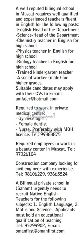 تعلن احدى المدارس ثنائية اللغى بسلطنة عمان عن حاجتها الى معلمين فى جميع التخصصات، وعلى الراغبين فى التقدم ارسال السيرة الذاتية على الايميل المنشور فى الاعلان التالى: