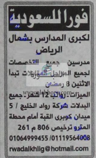تعلن كبرى المدارس بشمال الرياض بالمملكة العربية السعودية عن حاجتهاللتعاقد الفورى مع معلمين، وعلى الراغبين فى التقدم ارسال السيرة الذاتية من خلال الاعلان المنشورة فى جريدة الاهرام.