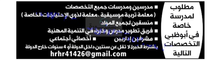 تعلن مدرسة خاصة في أبوظبي في دولة الامارات العربية المتحدة عن حاجتها للتعاقد مع معلمين وذلك في المواد التالية: