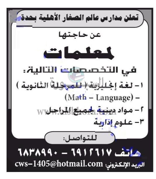 تعلن عدد من المدارس بمدينة جدة بالمملكة العربية السعودية عن وظائف شاغرة للمعملين وذلك وفقا لنص الإعلان التالي: