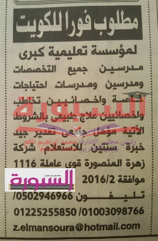 عن حاجتها للتعاقد الفورى مع مدرسين ومدرسات، وعلى الراغبين فى التقدم