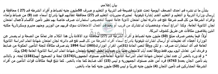 أصدرت وزارة التربية والتعليم بيانا بشأن ما تم نشره في احدى الصحف اليومية تحت عنوان: فضيحة فى التربية و التعليم و صرف 50 مليون جنيه لضباط و أفراد الشرطه فى (27 ) محافظة و إرسال وزارة التربية و التعليم و التعليم الفنى إشارة تليفونية لمديرى مديريات التعليم فى (27) محافظة تطالبهم فيها بإدراج أسماء عدد (9) من ضباط وأمناء وأفراد الشرطة من كل قسم شرطة تقع فى دائرته لجان امتحان ثانوية عامة تمهيدًا لتخصيص استمارات صرف خاصة بهم نظير تأمين الأقسام لأعمال امتحان لجان الثانوية العامة.