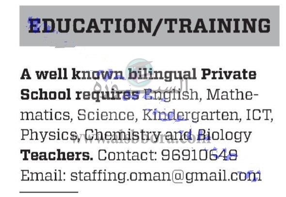 تعلن احدى المدارس بسلطنة عمان عن حاجتها الى معلمين فى جميع التخصصات، وعلى الراغبين فى التقدم ارسال السيرة الذاتية على الايميل المنشور فى الاعلان التالى: