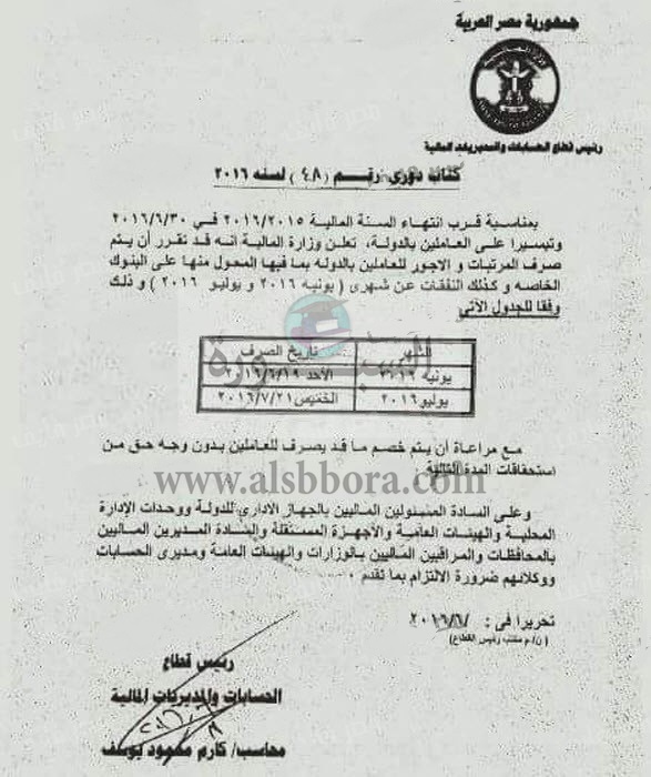 ارسلت وزارة المالية فاكسا الى جميع الوزارات والمصالح والهيئات الحكومية تعلنها عن مواعيد صرف راتبى شهرى يونيه ويوليو 2016، بمناسبة حلول عيد الفطر المبارك.
