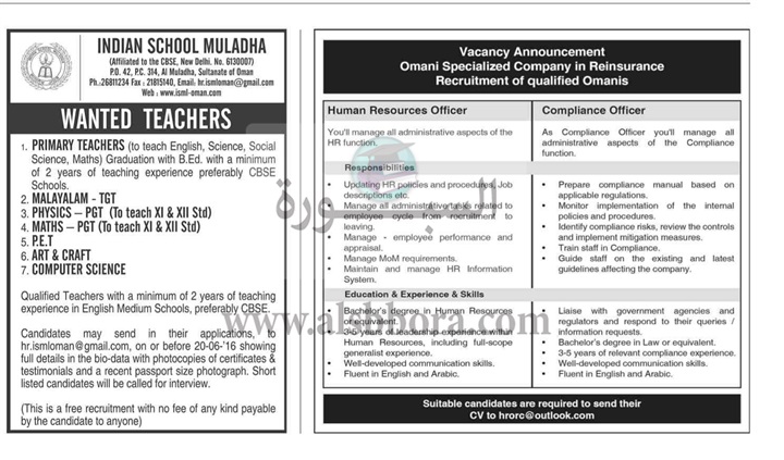 تعلن احدى المدارس الهندية بسلطنة عمان عن حاجتها الى معلمين فى جميع التخصصات، وعلى الراغبين فى التقدم ارسال السيرة الذاتية على الايميل المنشور فى الاعلان التالى: