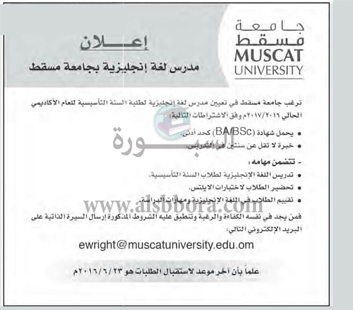 تعلن جامعة مسقط بسلطنة عمان عن حاجتها الى أعضاء هيئة التدريس وعلى الراغبين فى التقدم ارسال السيرة الذاتية على الايميل المنشور فى الاعلان التالى علما بان آخر موعد للتقديم يوم 2016/6/23.
