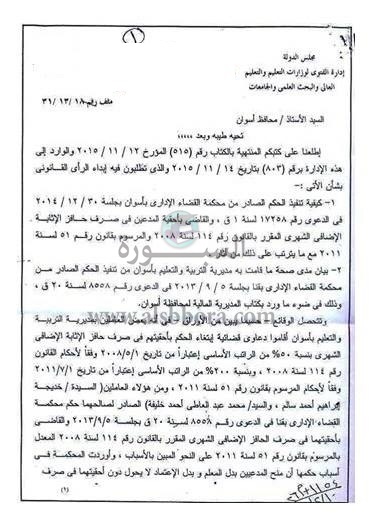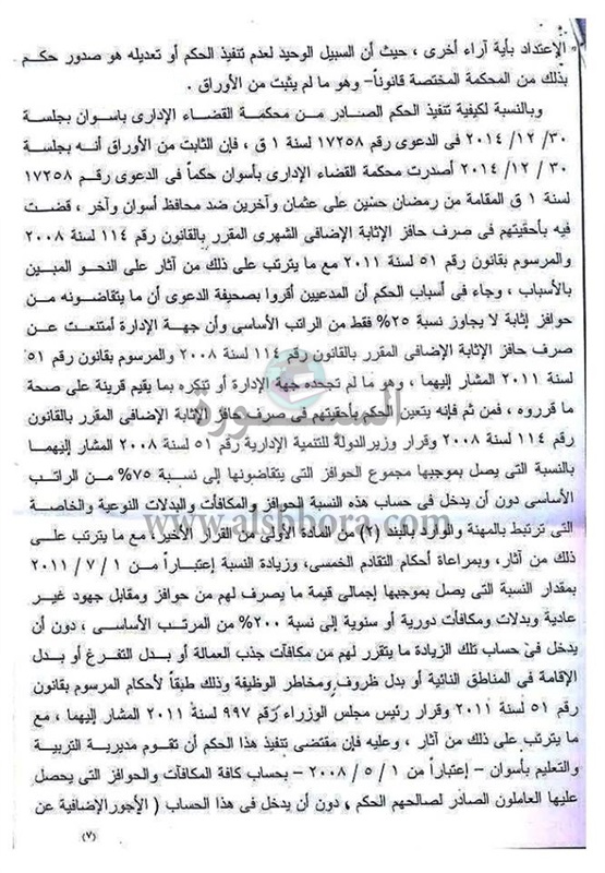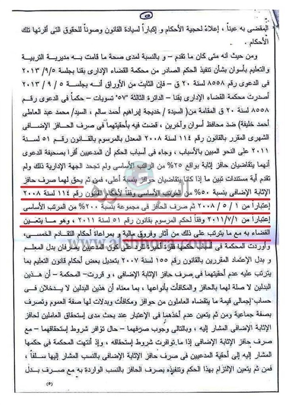 احقية صرف حافز الاثابة الاضافى بنسبة 50 % من المرتب الاساسى وفقا لأحكام القانون 114 لسنة 2008 اعتبارا من 1 / 5 / 2008 ثم صرف الحافز بنسبة 200 % من الراتب الاساسى اعتبارا من 1 / 7 2011 والزمت مديرية التربية والتعليم بأسوان بالالتزام باستمرار تنفيذ الحكم الصادر فى 30 / 12 / 2014 على النحو المبين بالاسباب.
