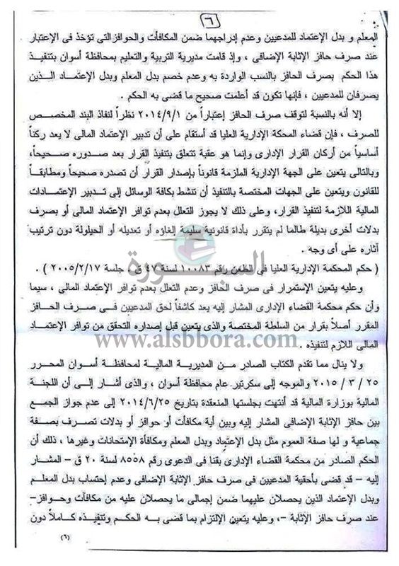الا انه بدءا من سبتمبر 2014 فوجئ المدعين بوقف الصرف لهذا الحافز للمذكورين بالدعوه وكل الحالات المماثلة لهم وبعد تقديم كل مايثبت حقوق المعلمين فى الحصول على الحافز الاضافى الشهرى والاطلاع على الحكم الصادر للمدعين فى 2013 رأت المحكمة :