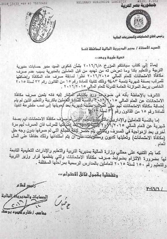 ارسلت وزارة المالية فاكس لادارة تعليم قنا بالتنبية بعدم صرف مكافأة الامتحانات