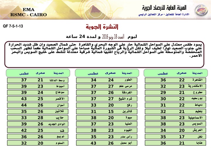 يتوقع خبراء هيئة الأرصاد الجوية أن يسود غدًا السبت، طقس معتدل على السواحل الشمالية حار على الوجه البحري والقاهرة حتى شمال الصعيد نهارا لطيف ليلا.