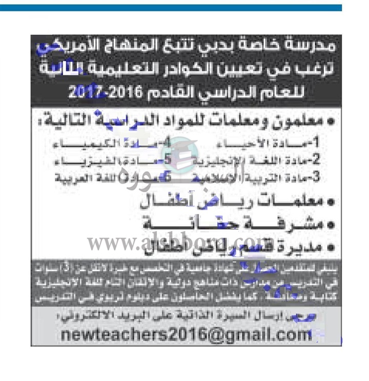 تعلن مدرسة خاصة في إمارة دبي بدولة الامارات المتحدة العربية معلمين ومعلمات وذلك وفقا لنص الإعلان التالي: