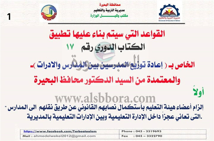 ينشر موقع السبورة التعليمى القواعد التى سيتم بناء عليها تطبيق الكتاب الدورة رقم 17 الخاص بـ "اعادة توزيع المدرسين بين المدارس والادارات"، حسب ما ورد من محافظ البحيرة الدكتور مصطفى هدهود.