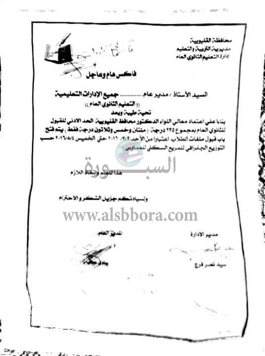 ننشر فاكس قبول الطلاب للثانوى العام بمجموع 235 درجة بالقليوبية