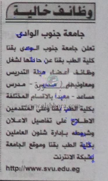 تعلن جامعة جنوب الوادي عن وظائف جديدة لأعضاء هيئة التدريس وذلك وفقا لنص الإعلان التالي: