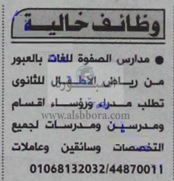 تعلن مدارس الصفوة للغات عن وظائف للمعلمين والمعلمات في جميع المواد وذلك وفقا لنص الاعلان التالي: