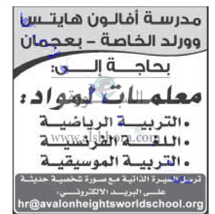 تعلن مدارس أفالون هايتس الاماراتية عن وظائف شاغرة للمعلمين في جميع المواد وذلك وفقا لنص الاعلان التالي: